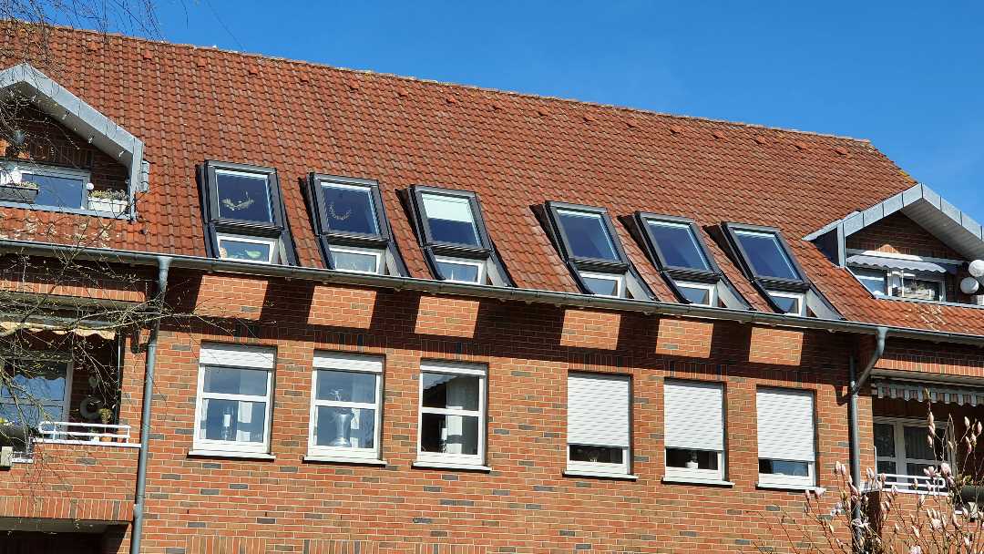 Die besondere Herausforderung hierbei war der Erhalt der Senkrechtfenster unter den eigentlichen Dachfenstern, in Verbindung mit der Fensterverlängerung bis in die Dachrinne und natürlich die Aufkeilrahmeninnenverkleidung aus Rigips nicht zu beschädigen.